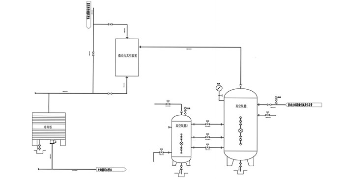微壓水噴射真空系統原理——利用0.05MPa~0.1MPa抵壓水源通過管道閥門進入噴射器的漸縮段,將靜壓頭轉換成動能,在噴嘴出成為高速射流使混合室形成微真空(負壓)狀態,將被抽介質吸入混合室,并使壓力和速度發生變化,在混合段內水和被抽介質得到充分的混合,然后經擴散段使再混合液降低流速、靜壓頭升高,再通過出口管道及閥門將混合液送至池內進行分離,完成做功。設備運行穩定,節能率在95%以上。